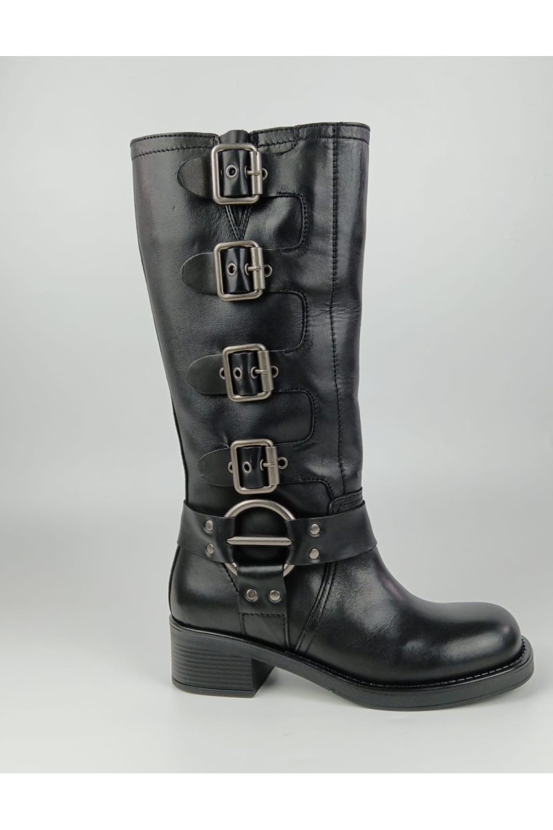 Botas estilo biker en 100% PIEL en color negro con hebilla lateral. Tallan perfectas, por lo que recomendamos tu talla habitual.
